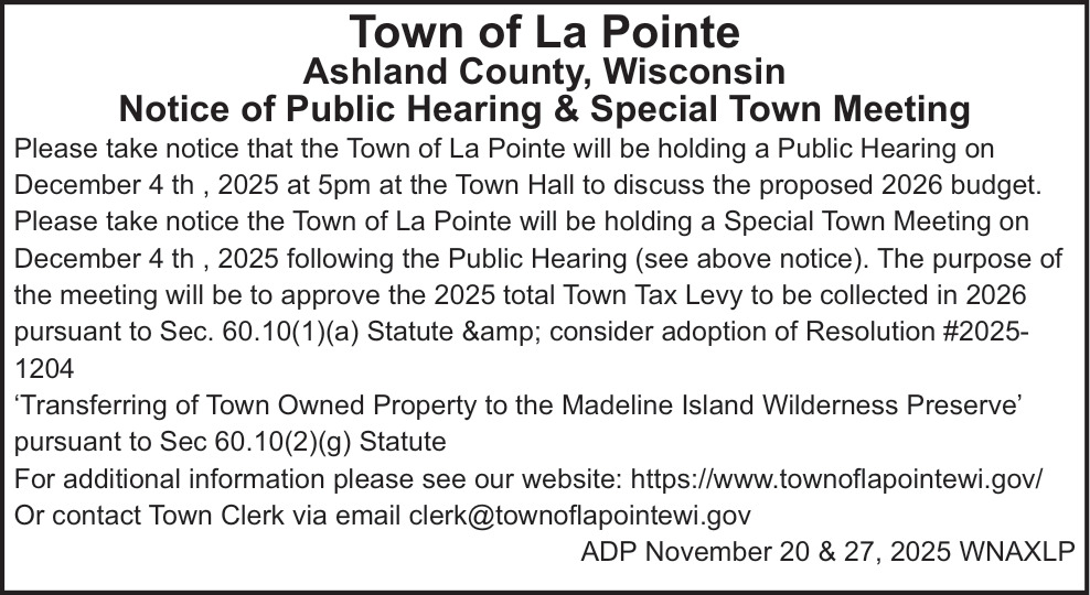 Nov 20, 2025. Town Of La Pointe Public Notice Ads from Ashland Daily Press