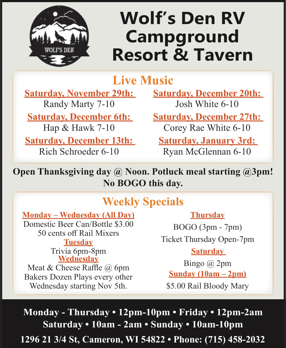 Nov 26, 2025. Wolf's Den RV Campground Campground Ads from Rice Lake Chronotype
