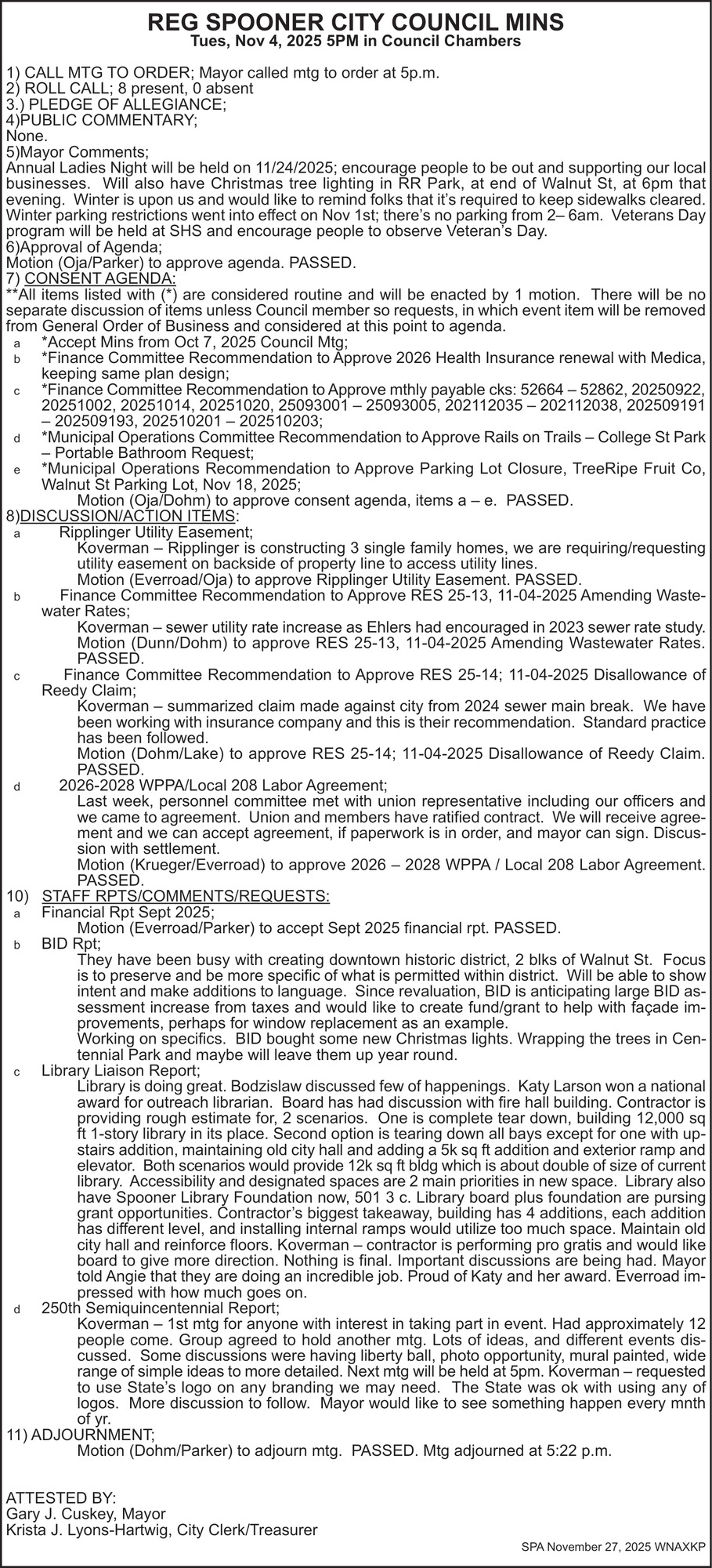 Nov 27, 2025. City of Spooner Public Notice Ads from Spooner Advocate