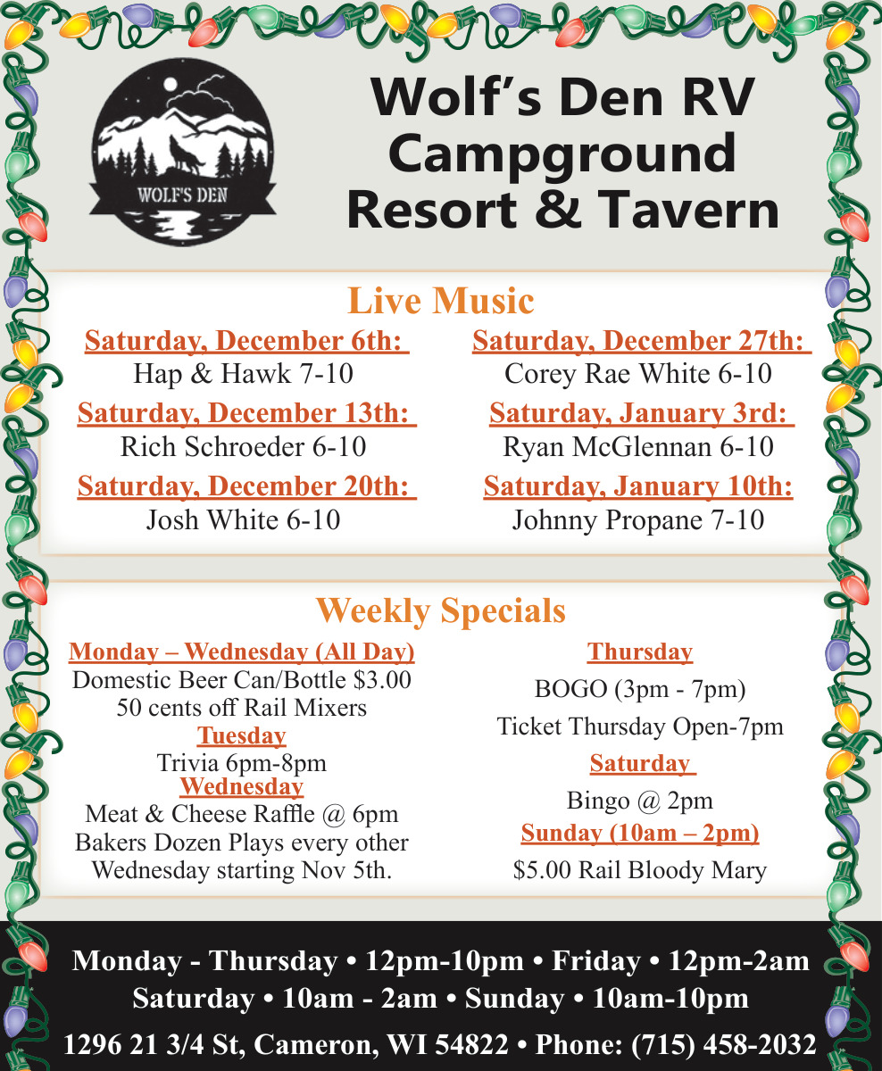Dec 03, 2025. Wolf's Den RV Campground Campground Ads from Rice Lake Chronotype