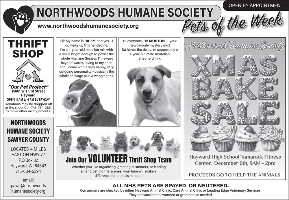 Dec 03, 2025. Northwoods Humane Society Organization Ads from Sawyer County Record