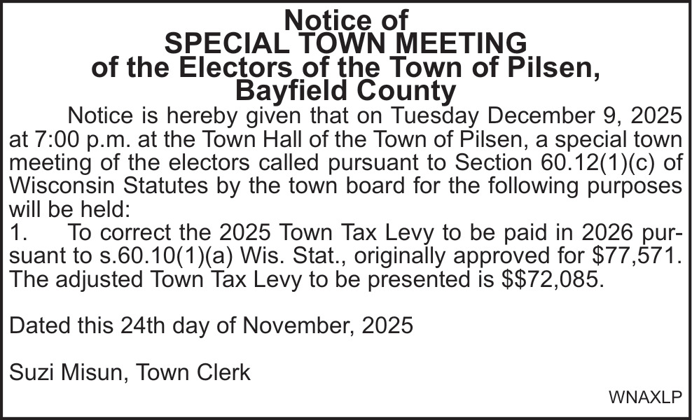 Dec 04, 2025. Town Of Pilsen Public Notice Ads from Ashland Daily Press