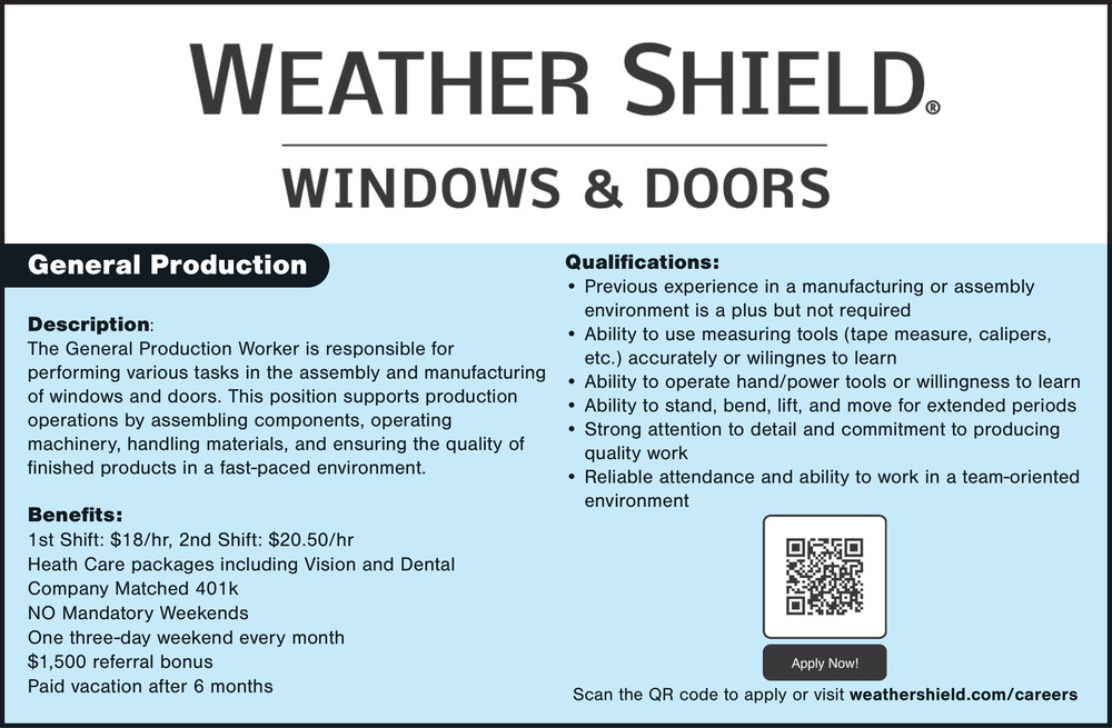 Dec 06, 2025. Weather Shield Windows and Doors - Park Falls Jobs Ads from Ashland Daily Press