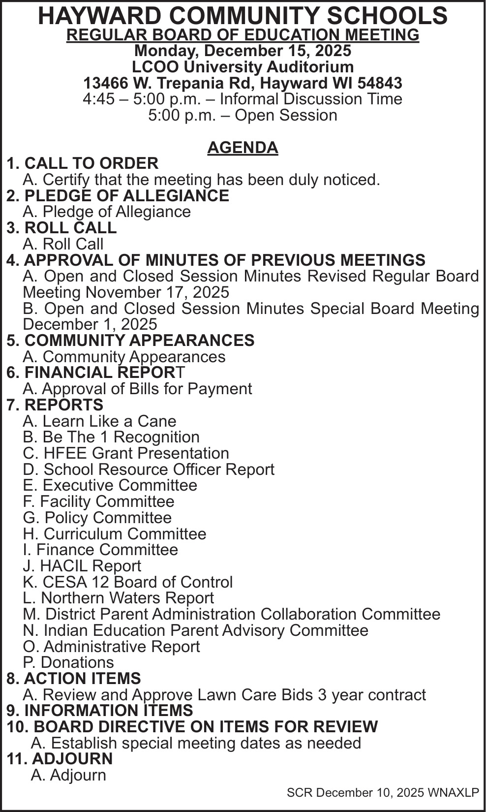 Dec 10, 2025. Hayward Community School District Public Notice Ads from Sawyer County Record