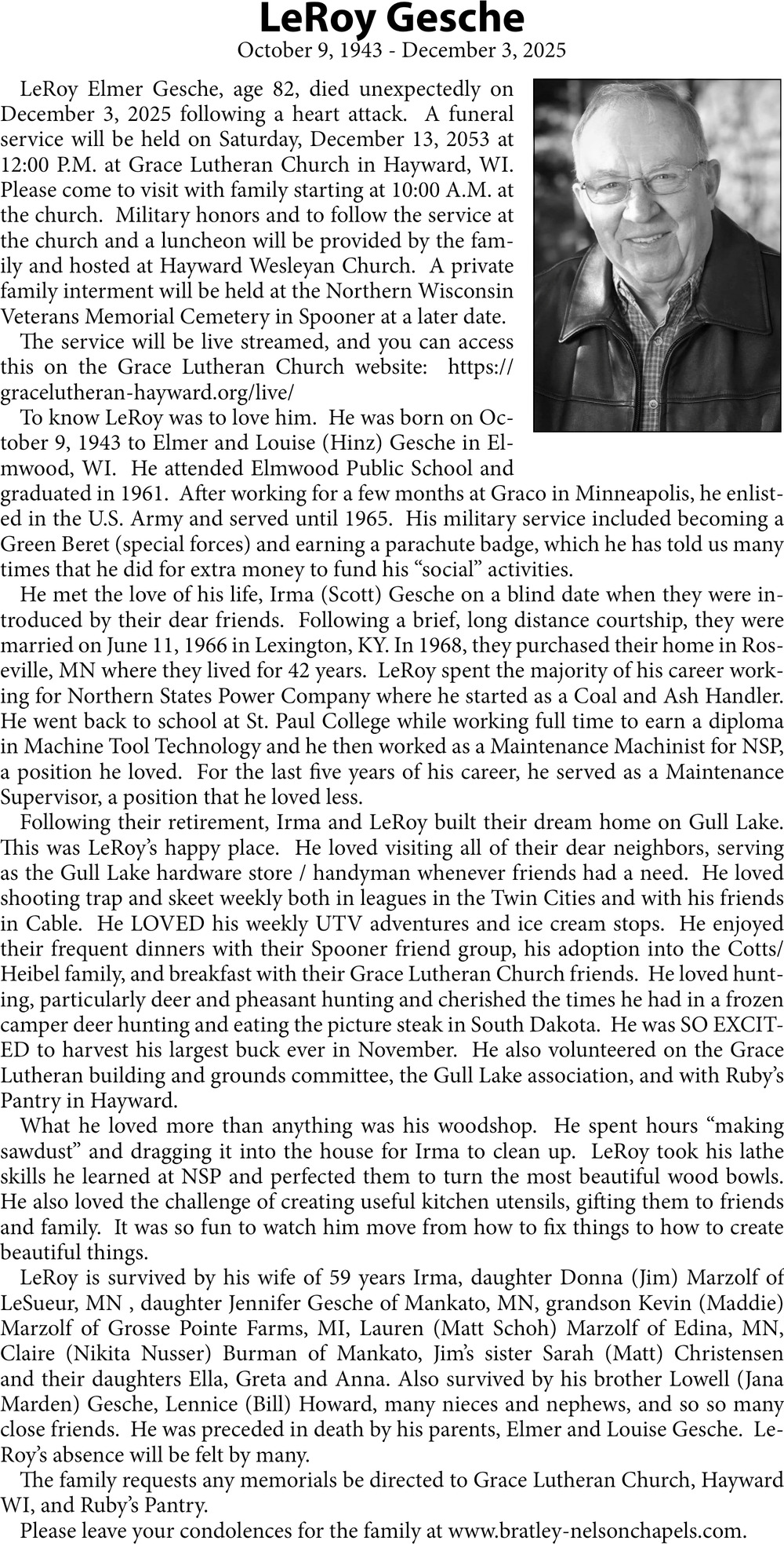 Dec 17, 2025. Hayward Funeral Home Obituaries Ads from Sawyer County Record