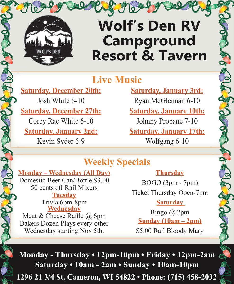 Dec 17, 2025. Wolf's Den RV Campground Campground Ads from Rice Lake Chronotype