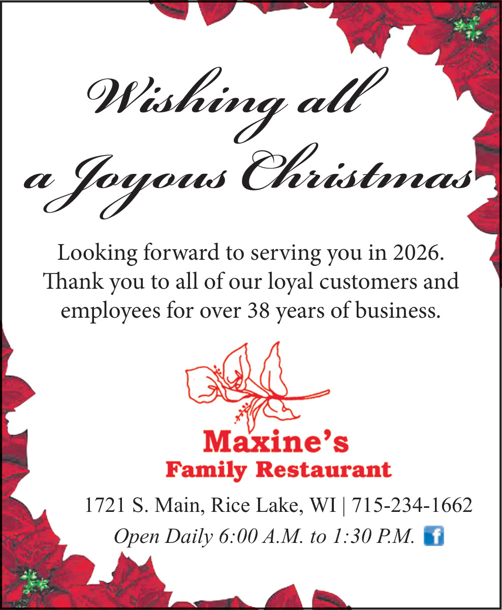 Dec 17, 2025. Maxine's Family Restaurant Restaurants Ads from Rice Lake Chronotype