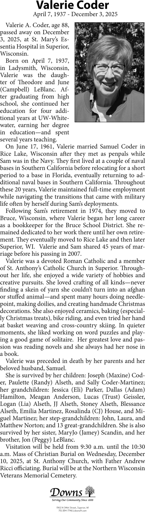 Dec 17, 2025. Downs Funeral Home Funeral Homes Ads from Rice Lake Chronotype