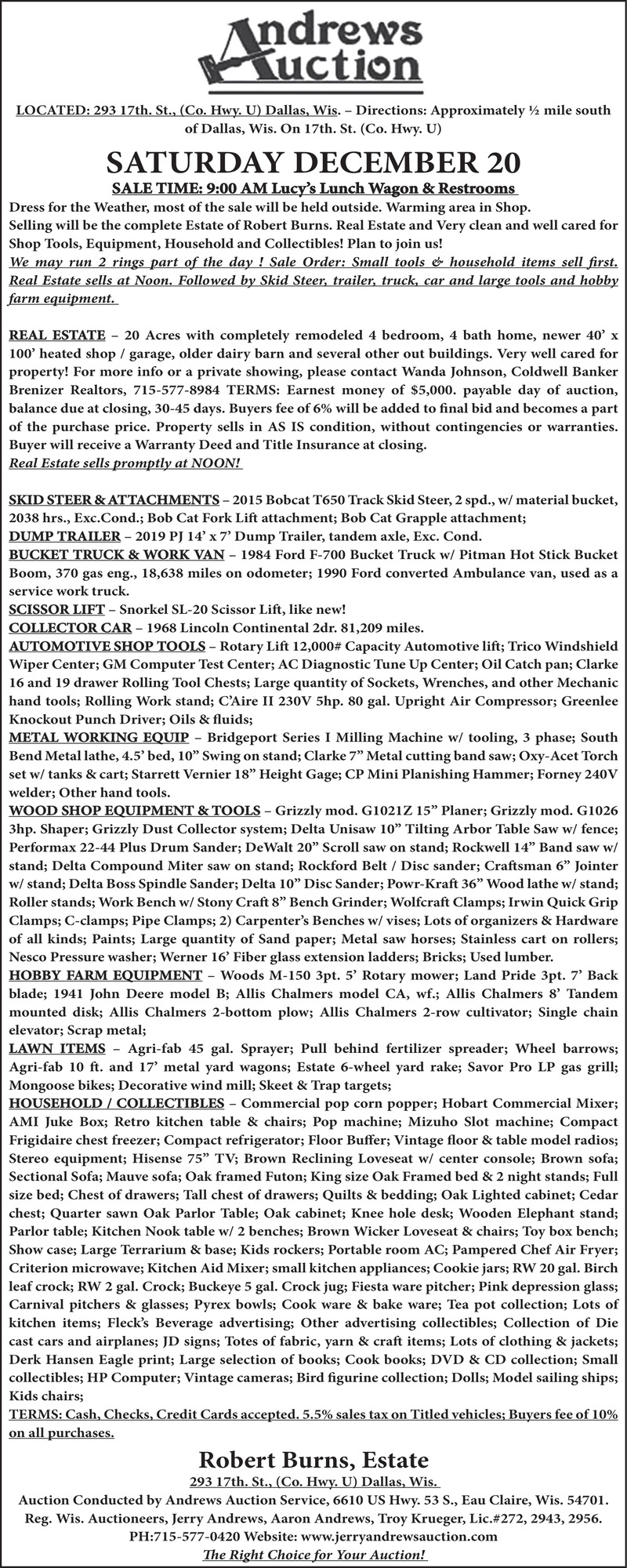 Dec 17, 2025. Andrews Auction Auctions Ads from Rice Lake Chronotype