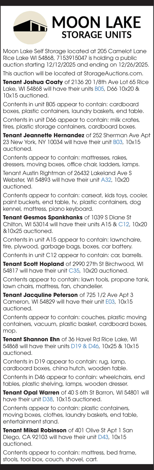 Dec 17, 2025. Moon Lake Storage Units Storage Ads from Rice Lake Chronotype