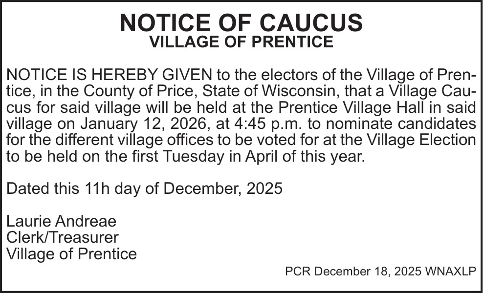 Dec 18, 2025. Village Of Prentice Public Notice Ads from Price County Review