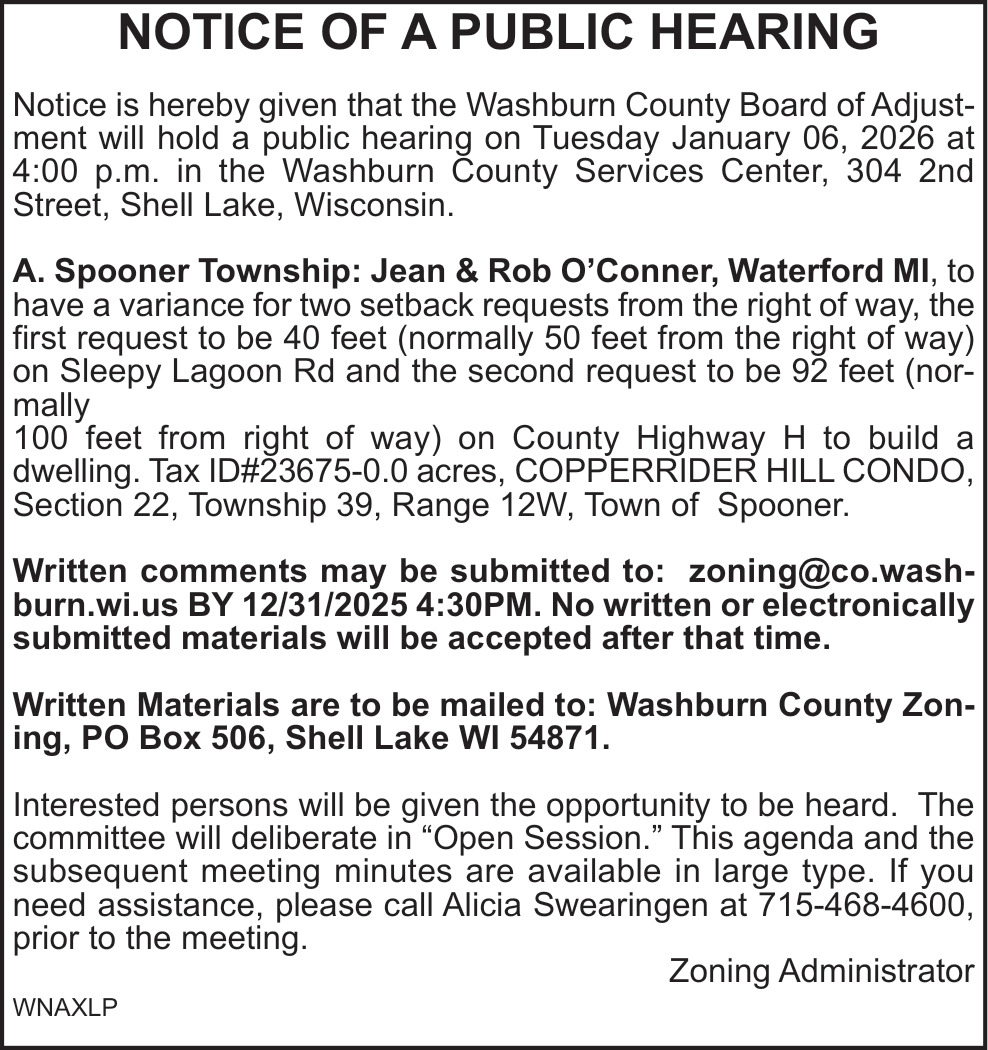 Dec 18, 2025. Alicia Swearingen - Washburn County Clerk Public Notice Ads from Spooner Advocate