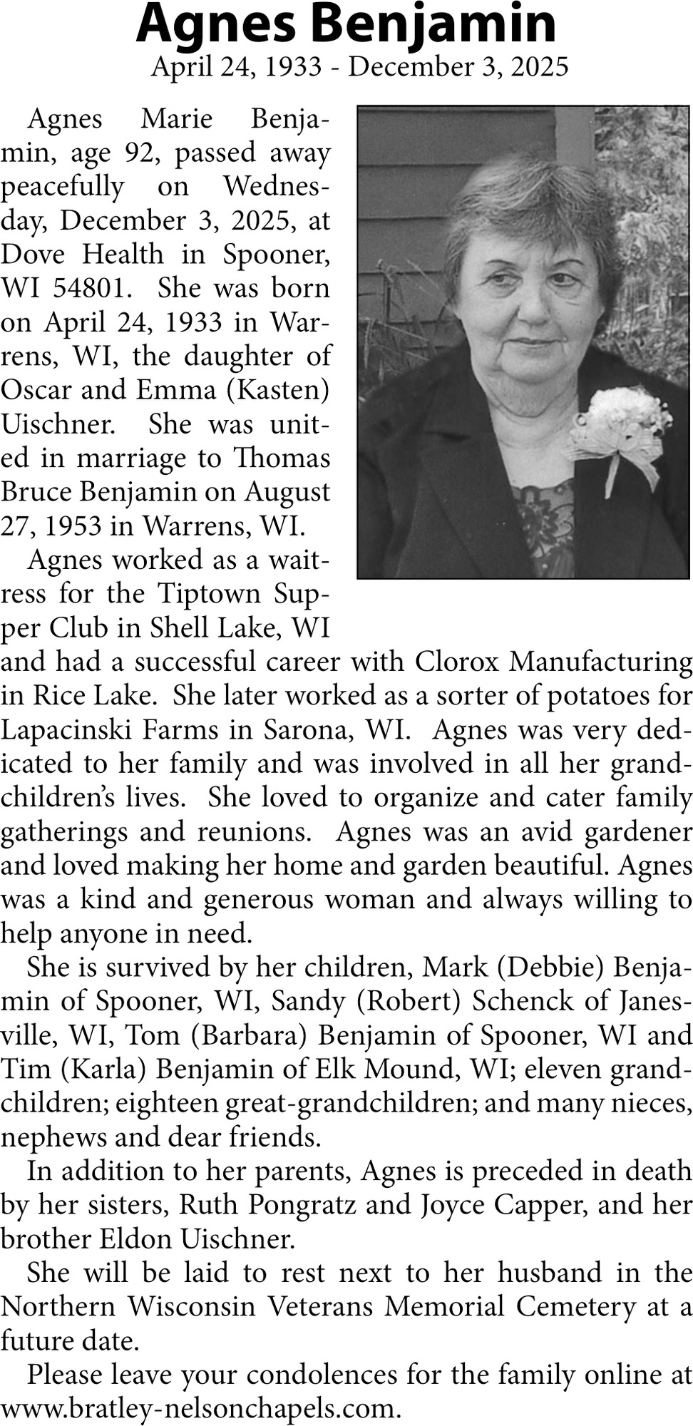 Dec 18, 2025. Bratley-Nelson Funeral Homes & Crematory Obituaries Ads from Spooner Advocate
