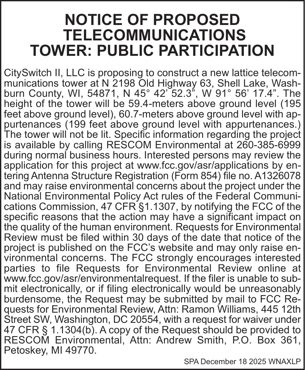 Dec 18, 2025. Federal Communications Commision Public Notice Ads from Spooner Advocate