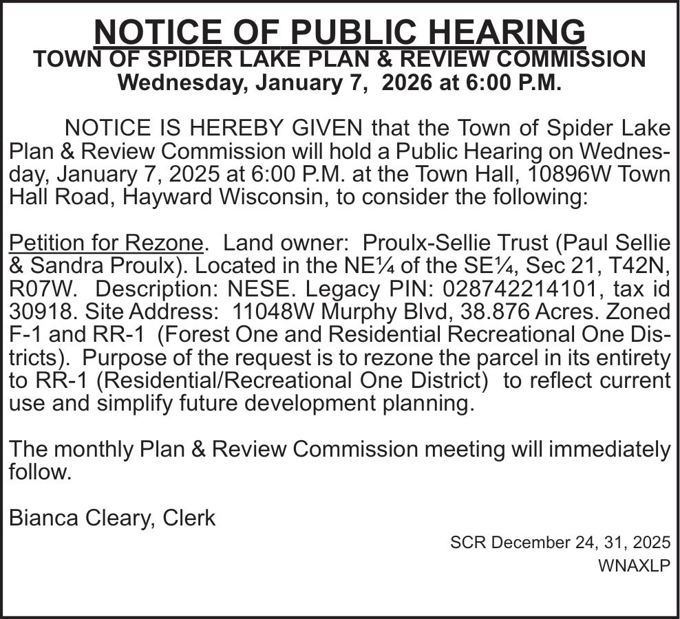 Dec 24, 2025. Town of Spider Lake Public Notice Ads from Sawyer County Record