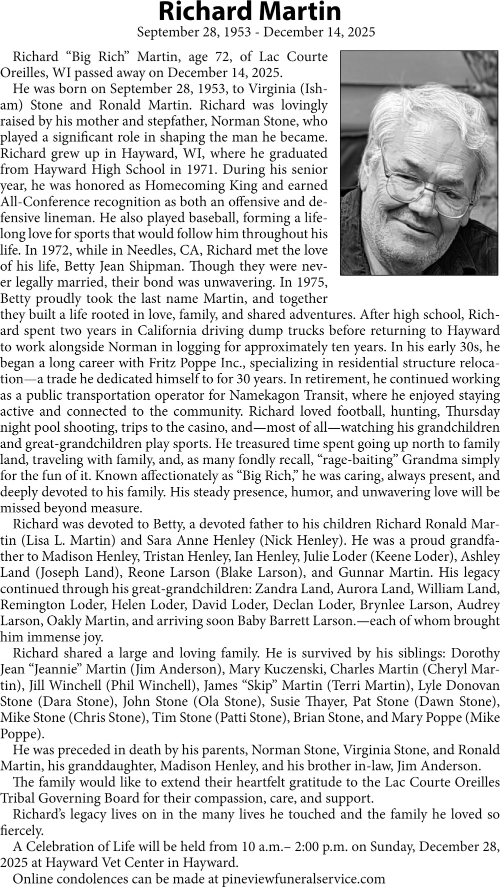 Dec 24, 2025. Pineview Funeral Service Obituaries Ads from Sawyer County Record