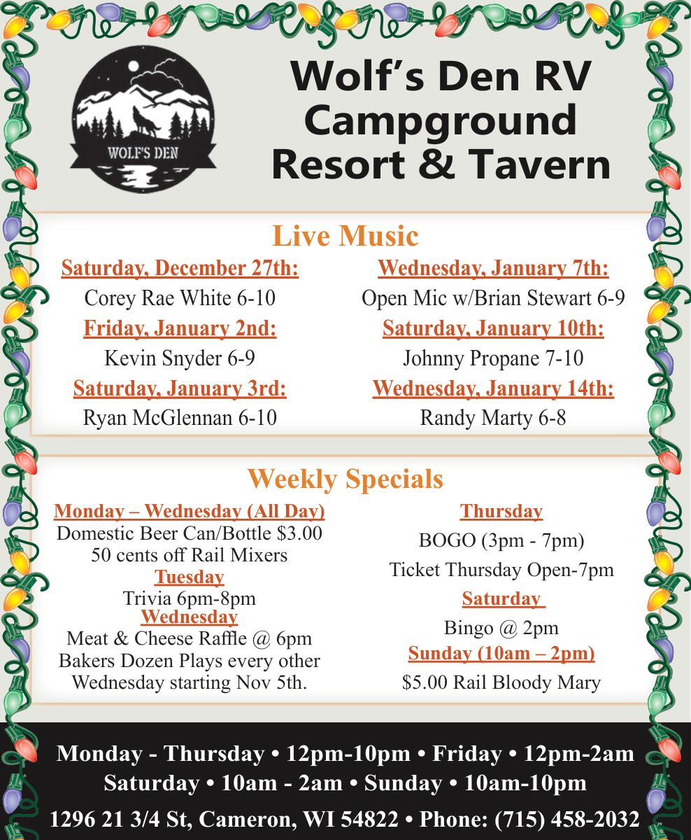 Dec 24, 2025. Wolf's Den RV Campground Campground Ads from Rice Lake Chronotype