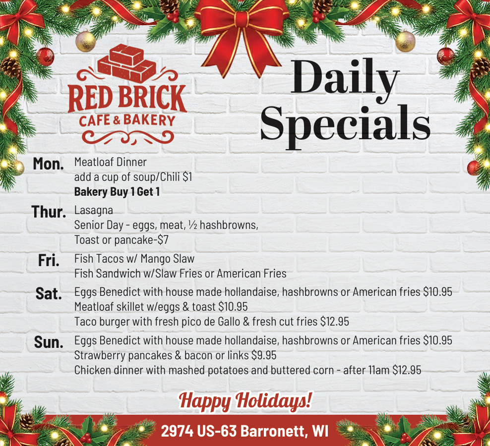 Dec 24, 2025. Red Brick Cafe & bakery Restaurants Ads from Rice Lake Chronotype