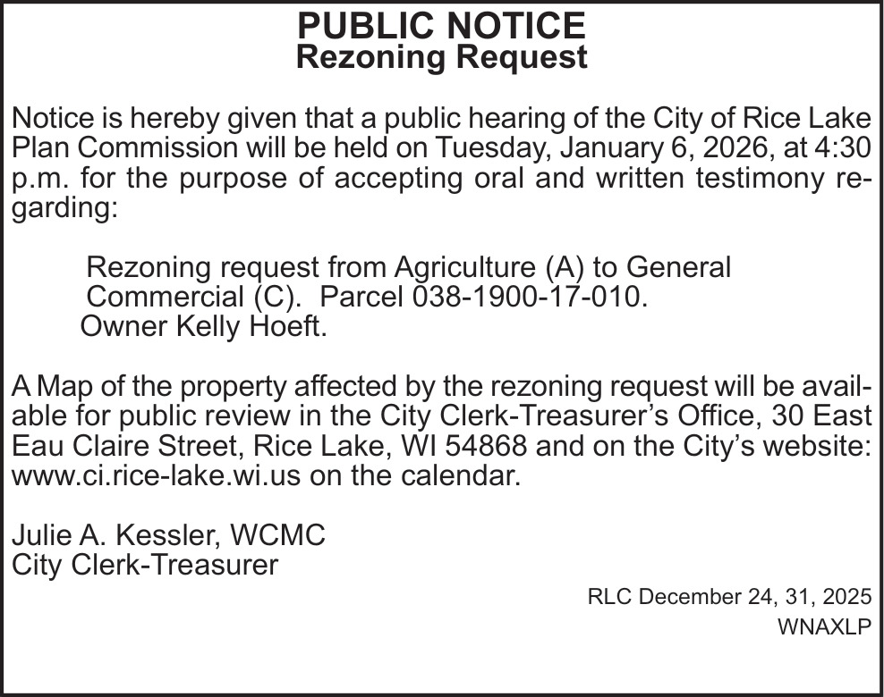 Dec 24, 2025. City of Rice Lake Public Notice Ads from Rice Lake Chronotype
