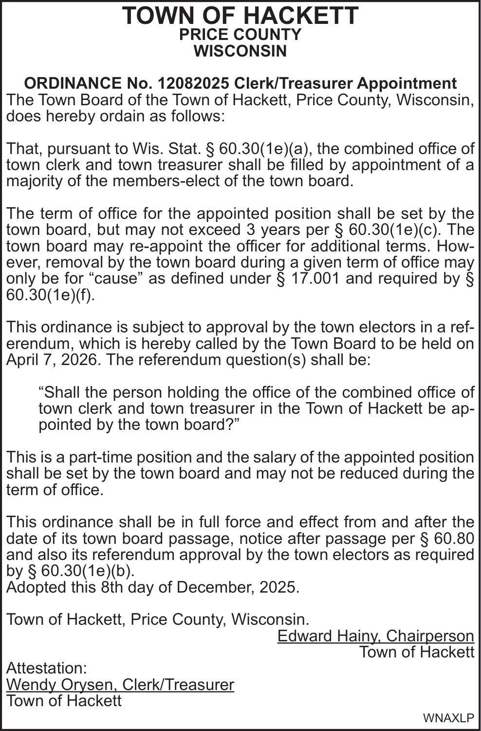 Dec 25, 2025. Town of Hackett Public Notice Ads from Price County Review