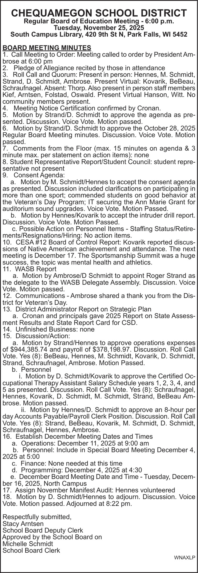 Dec 25, 2025. Chequamegon School District Public Notice Ads from Price County Review
