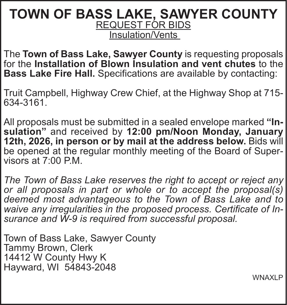Dec 31, 2025. Town of Bass Lake Public Notice Ads from Sawyer County Record