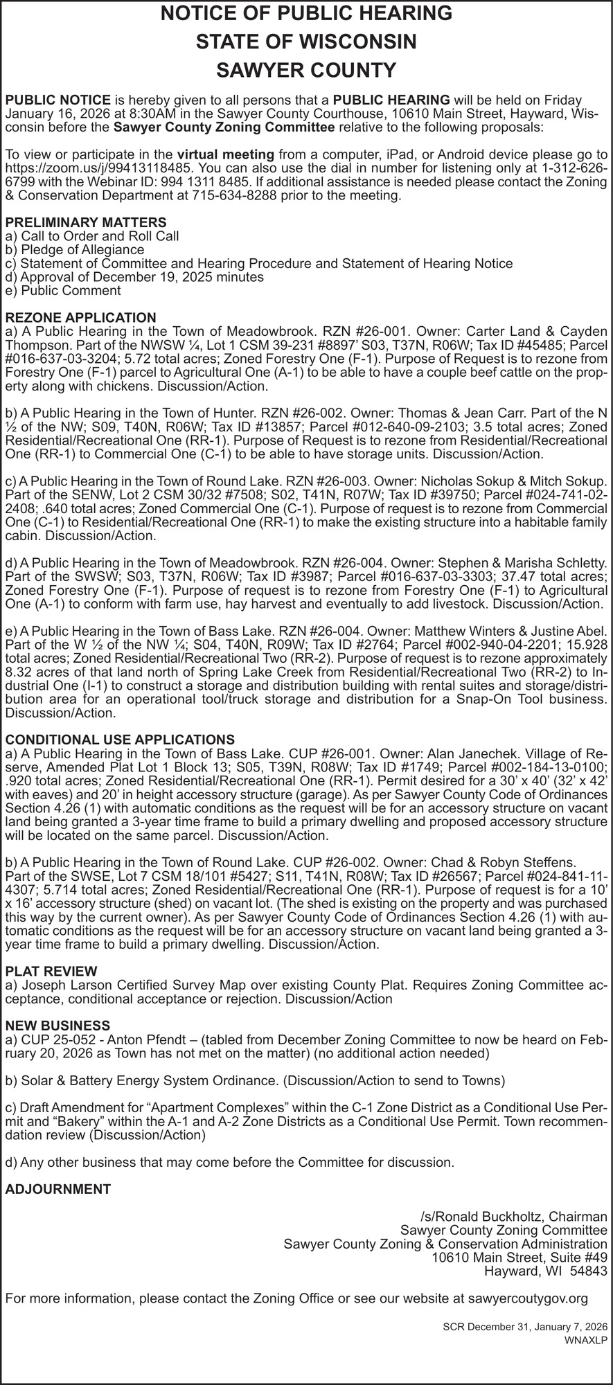 Dec 31, 2025. Sawyer County Public Notice Ads from Sawyer County Record