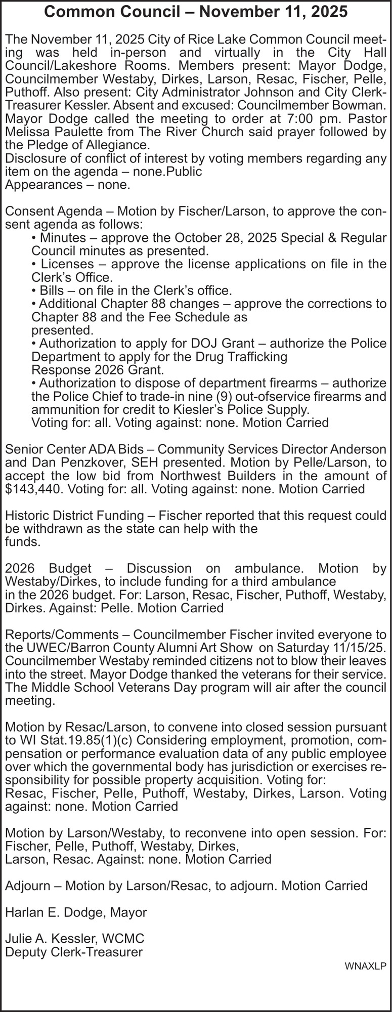 Dec 31, 2025. City of Rice Lake Public Notice Ads from Rice Lake Chronotype