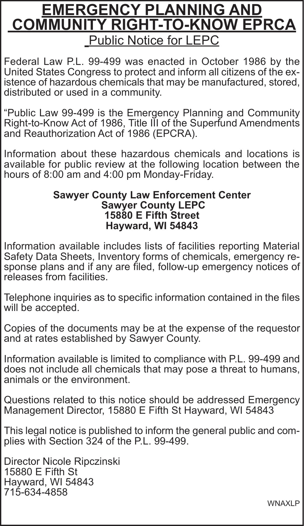Jan 14, 2026. Sawyer County Law Enforcement Center Public Notice Ads from Sawyer County Record