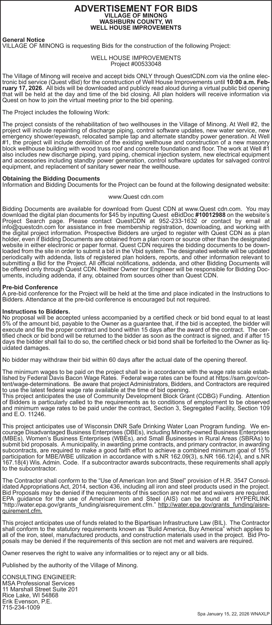 Jan 15, 2026. Village of Minong Public Notice Ads from Spooner Advocate