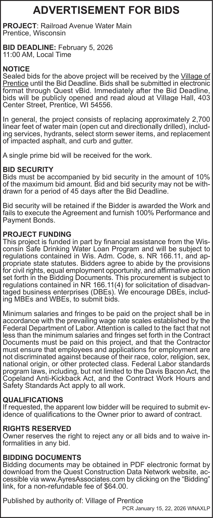 Jan 15, 2026. Village Of Prentice Public Notice Ads from Price County Review