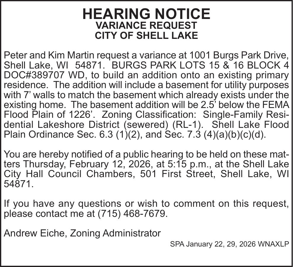 Jan 22, 2026. City of Shell Lake Public Notice Ads from Spooner Advocate