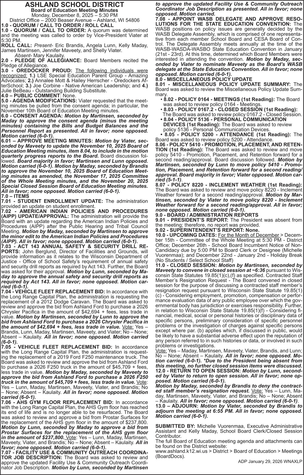 Jan 29, 2026. School District of Ashland Public Notice Ads from Ashland Daily Press