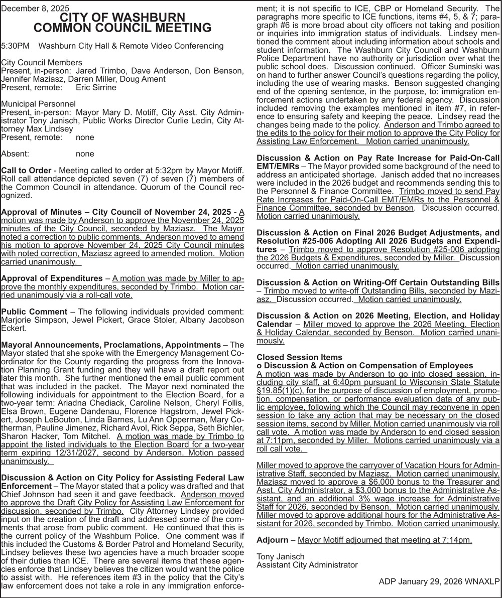 Jan 29, 2026. City Of Washburn Public Notice Ads from Ashland Daily Press