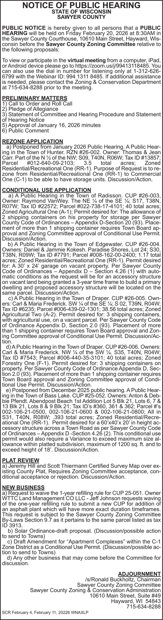 Feb 04, 2026. Sawyer County Public Notice Ads from Sawyer County Record