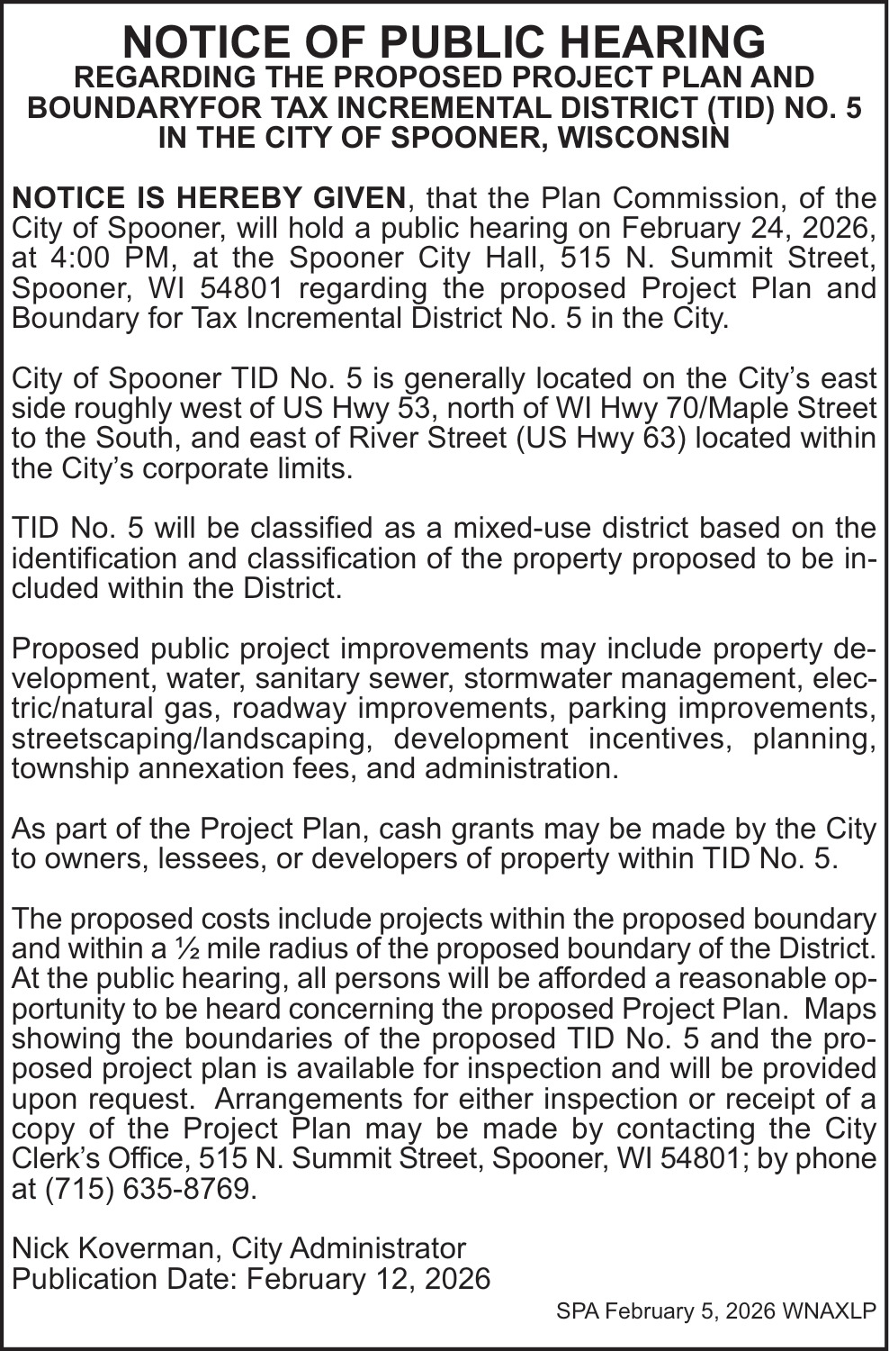 Feb 05, 2026. City of Spooner Public Notice Ads from Spooner Advocate