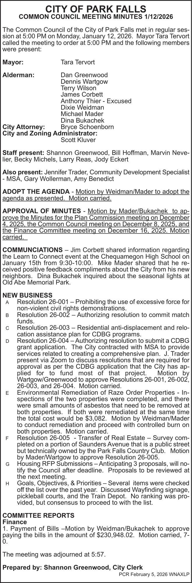 Feb 05, 2026. City of Park Falls Public Notice Ads from Price County Review