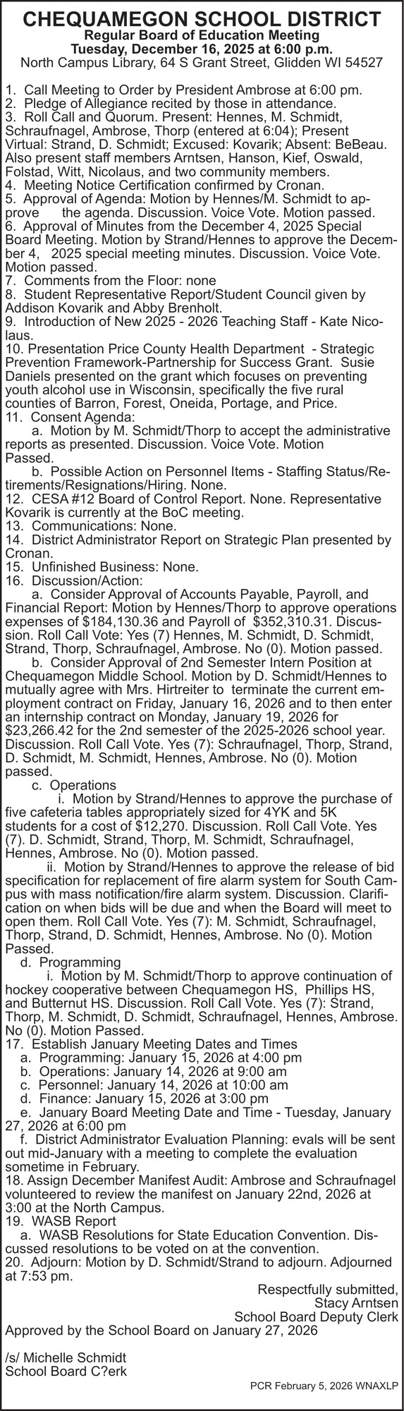 Feb 05, 2026. Chequamegon School District Public Notice Ads from Price County Review
