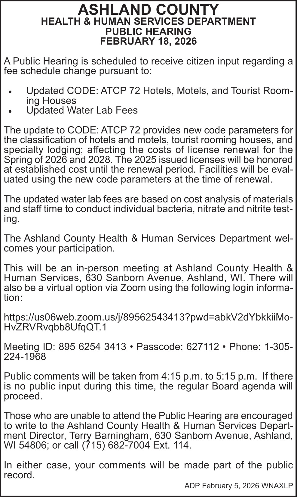 Feb 05, 2026. Ashland County Health & Human Services Department Government Ads from Ashland Daily Press