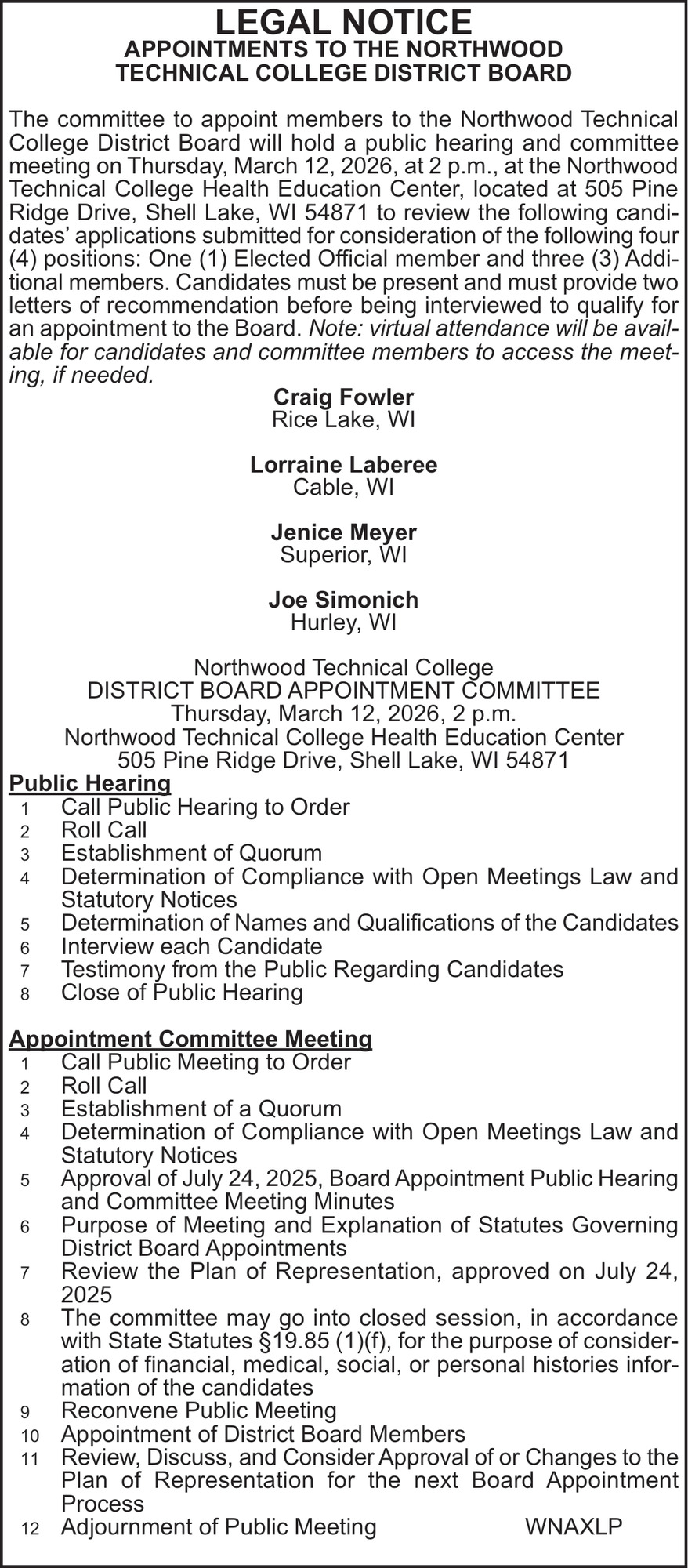 Feb 18, 2026. Northwood Technical College Events Ads from Sawyer County Record