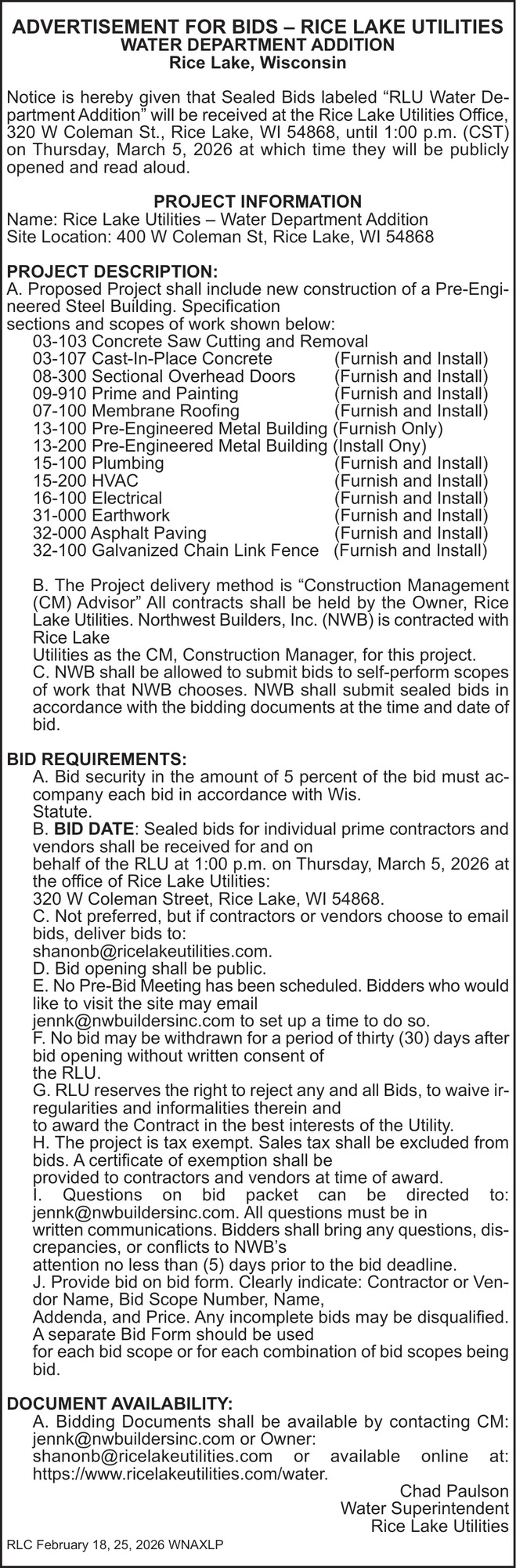 Feb 18, 2026. Rice Lake Utilities Utilities Ads from Rice Lake Chronotype