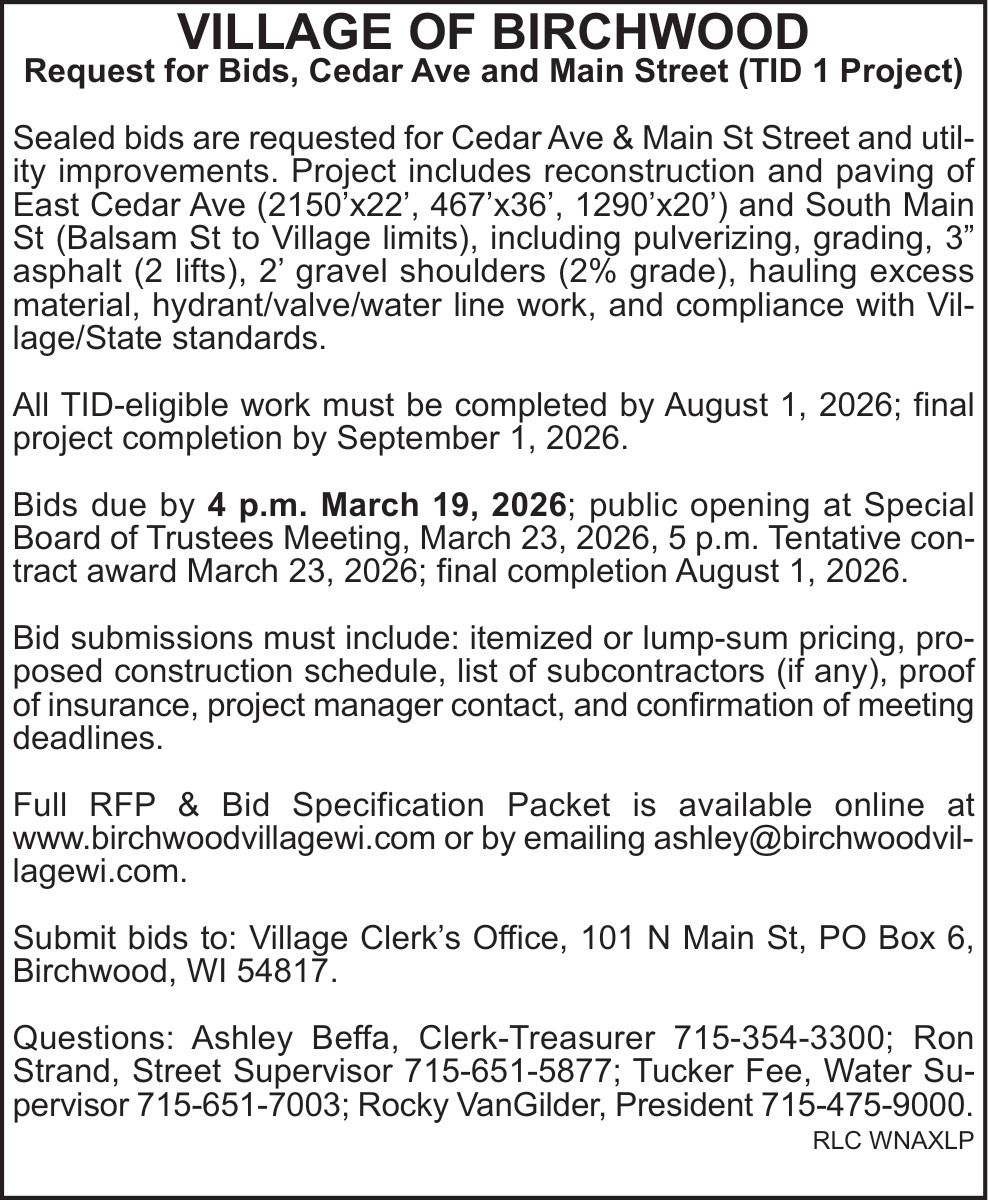 Feb 18, 2026. Village of Birchwood Public Notice Ads from Rice Lake Chronotype