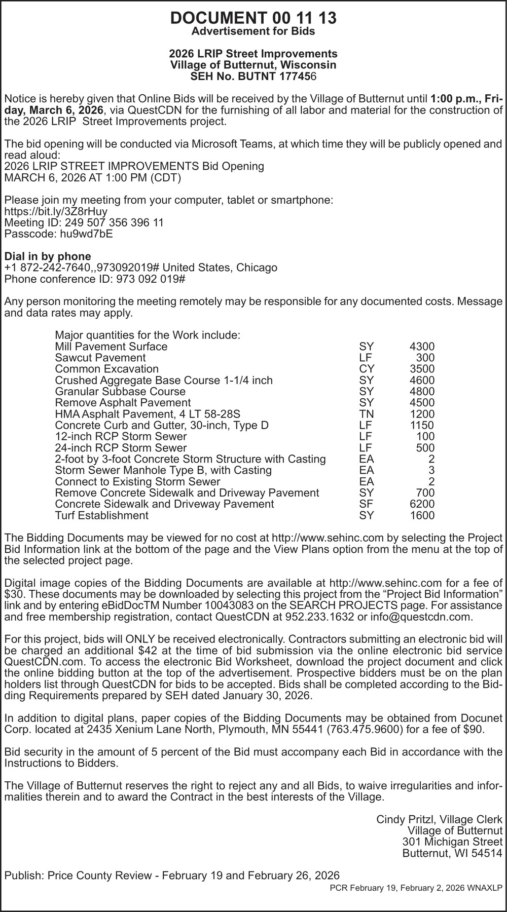 Feb 19, 2026. Village Of Butternut Public Notice Ads from Price County Review