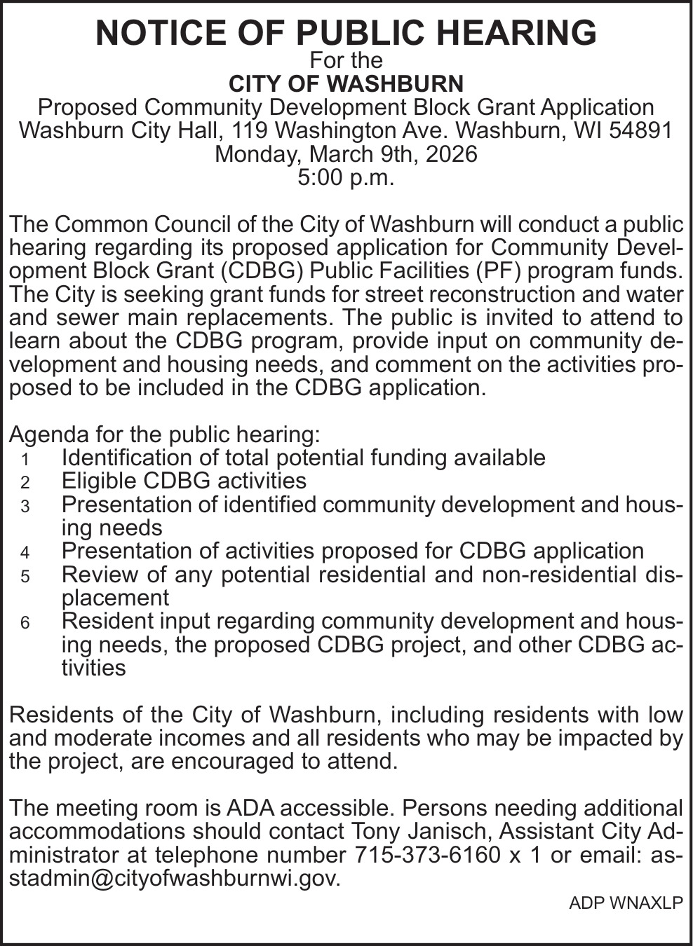 Feb 19, 2026. City Of Washburn Public Notice Ads from Ashland Daily Press