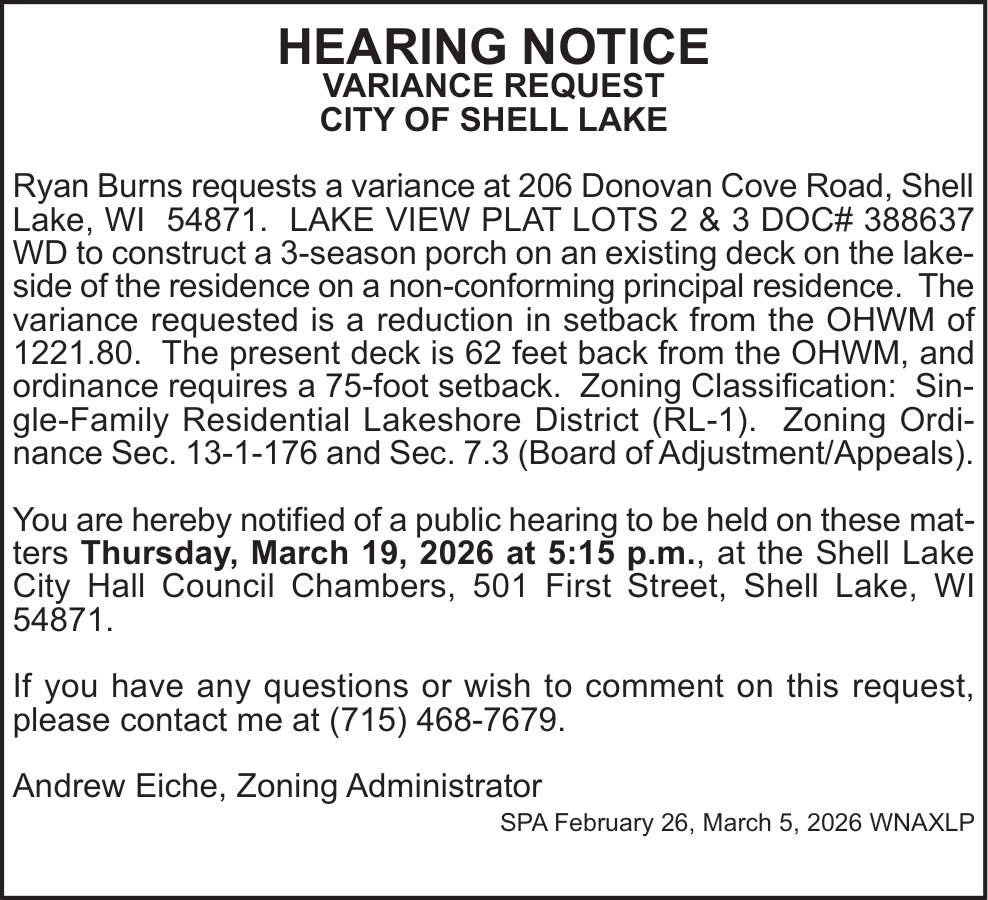 Feb 26, 2026. City of Shell Lake Public Notice Ads from Spooner Advocate