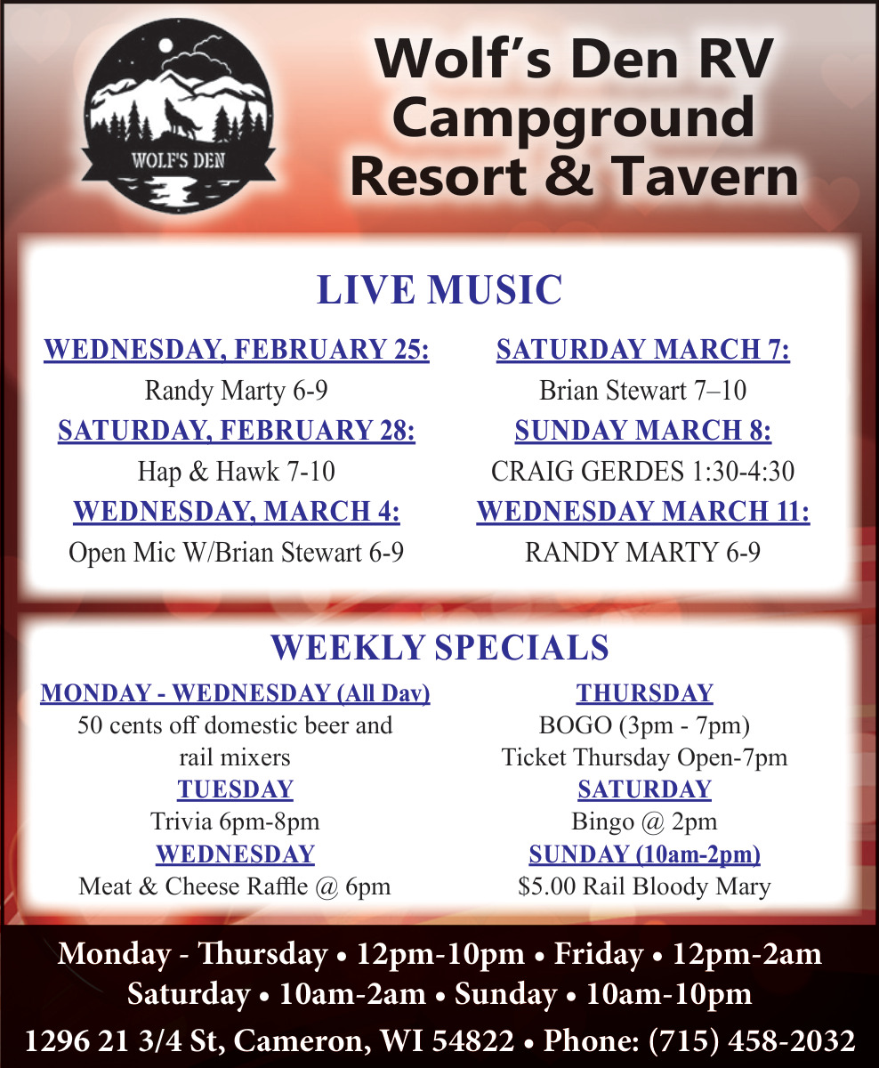 Feb 25, 2026. Wolf's Den RV Campground Campground Ads from Rice Lake Chronotype