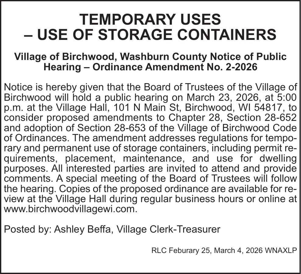 Feb 25, 2026. Village of Birchwood Public Notice Ads from Rice Lake Chronotype