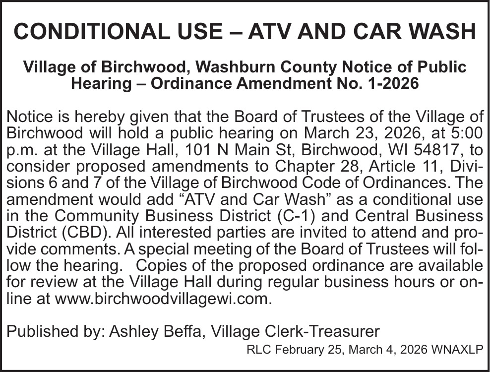 Feb 25, 2026. Village of Birchwood Public Notice Ads from Rice Lake Chronotype