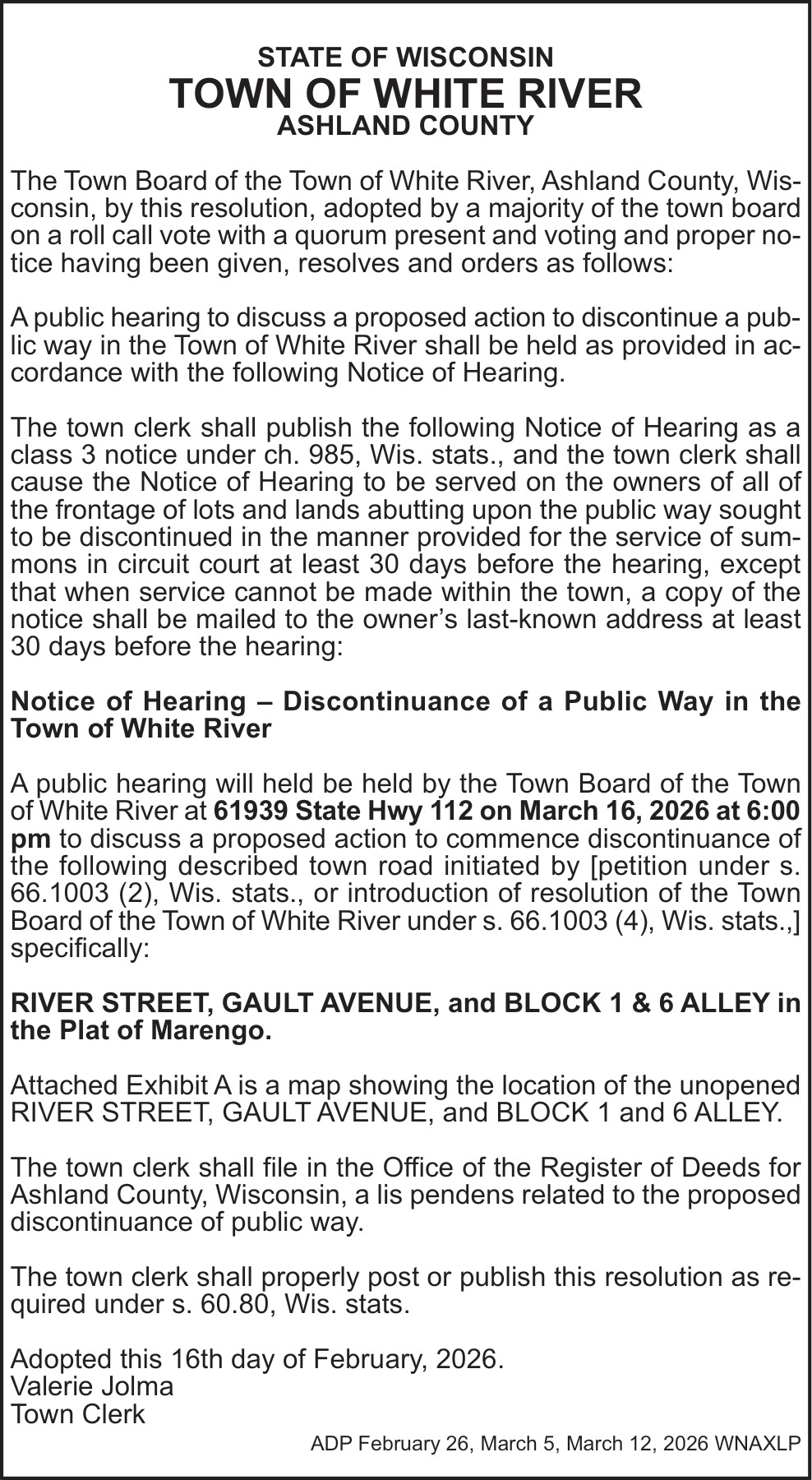 Feb 26, 2026. Town Of White River Public Notice Ads from Ashland Daily Press