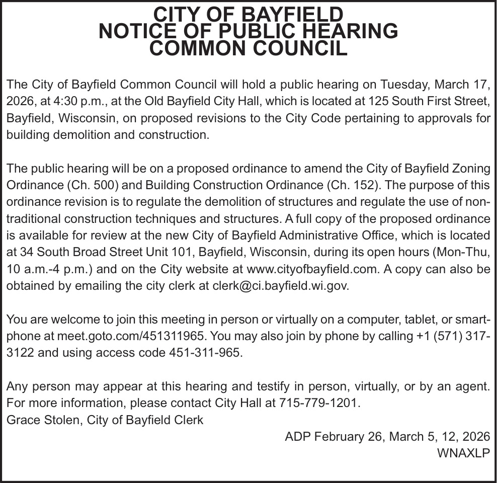 Feb 26, 2026. City of Bayfield Public Notice Ads from Ashland Daily Press